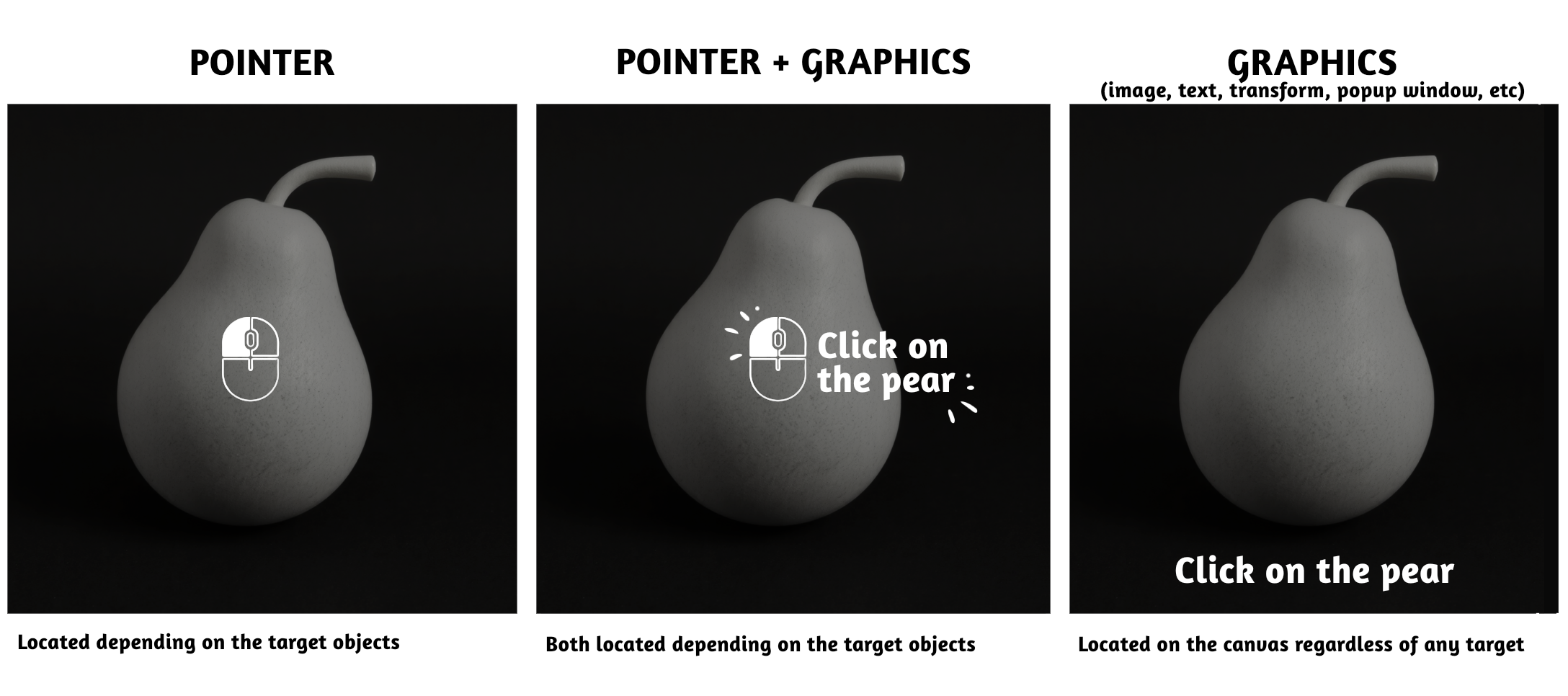 | Is positioned relative to target objects in the scene (indicating what to interact with)  | Placed somewhere on the canvas independently                                               |